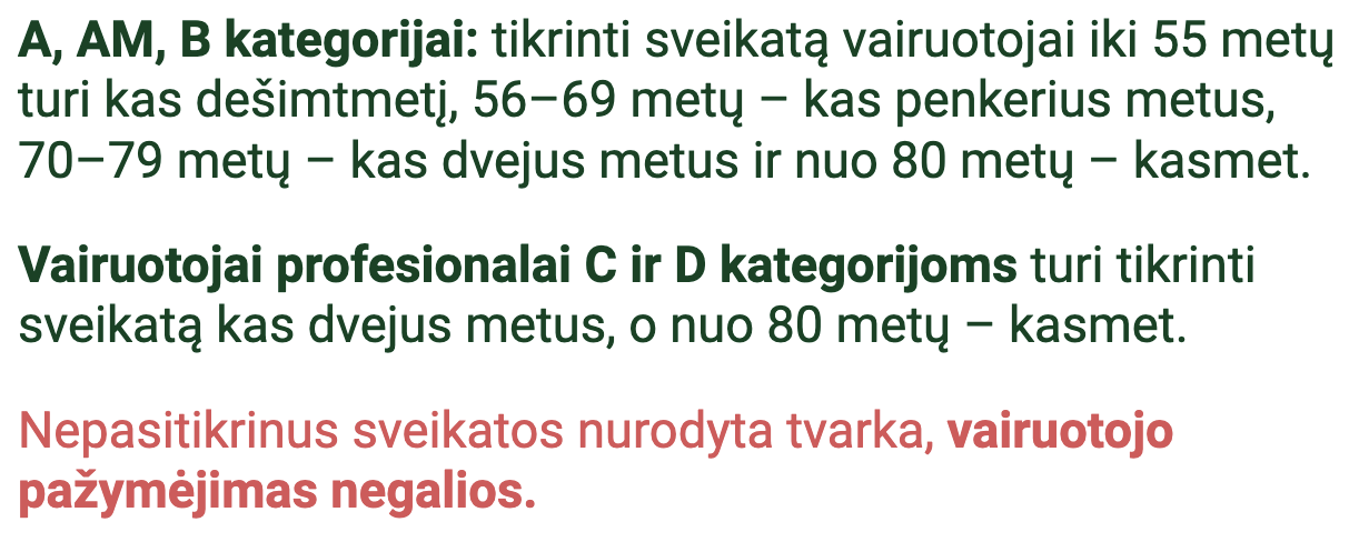 Vairuotojai profesionalai C ir D kategorijoms turi tikrintis sveikatą kas dvejus metus, o nuo 80 metų – kasmet.